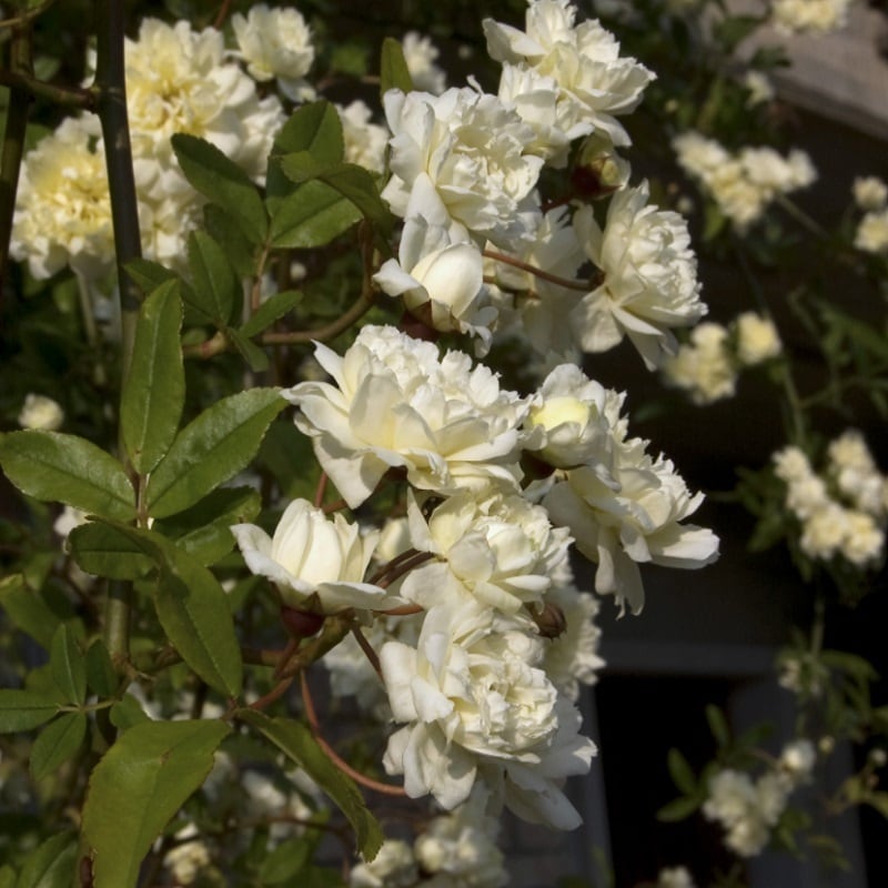 一重咲き白モッコウバラ 木香薔薇の名の通りスミレのような澄んだ香り。黄色の八重咲き種よりも花びらが少なく花芯を覗かせる。強健
