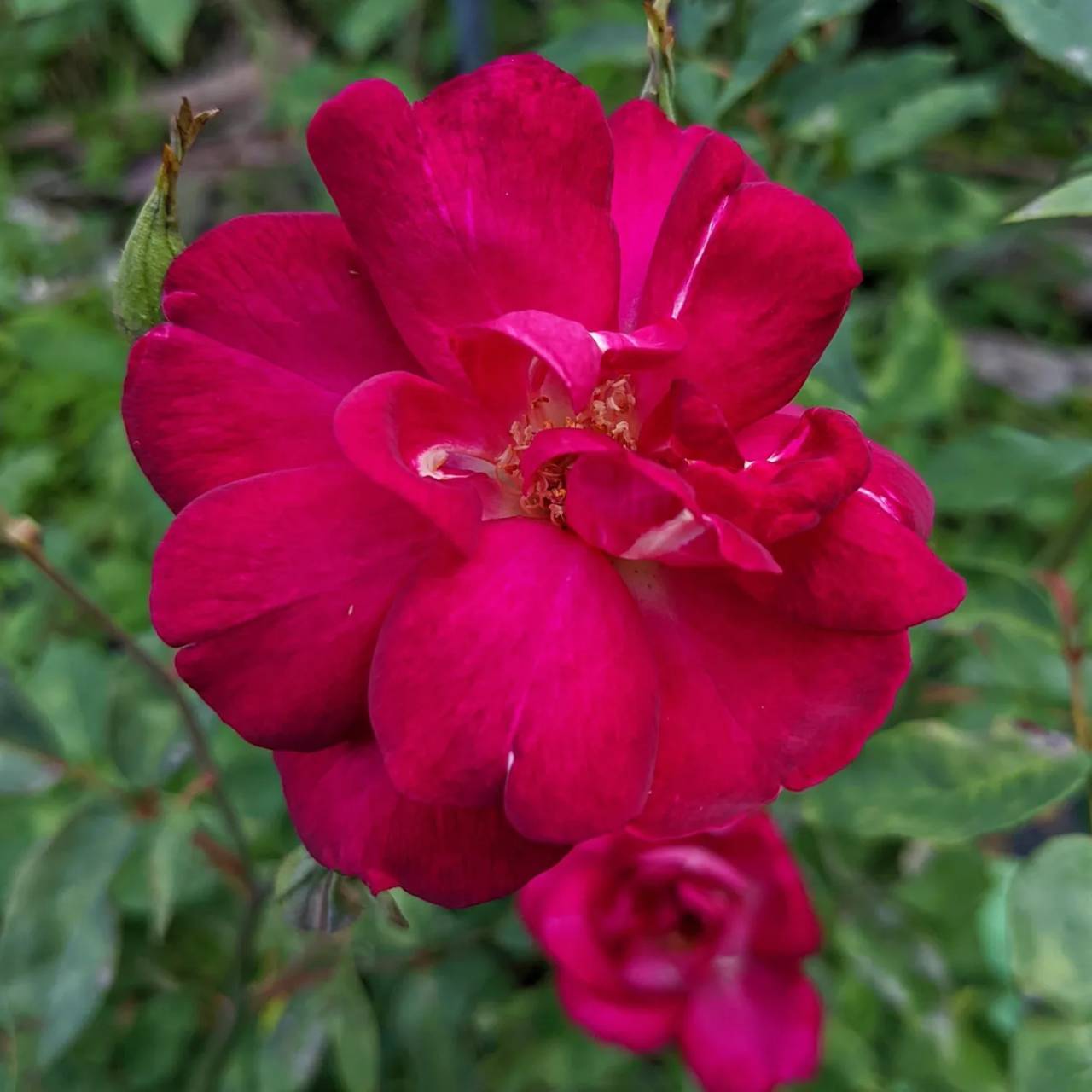 明るい赤、時に赤紫の半八重。花芯が覗くさまが愛らしい。チャイナ・ローズらしく枝が細く、旺盛とはいえないが樹は横張りに成長する。強健