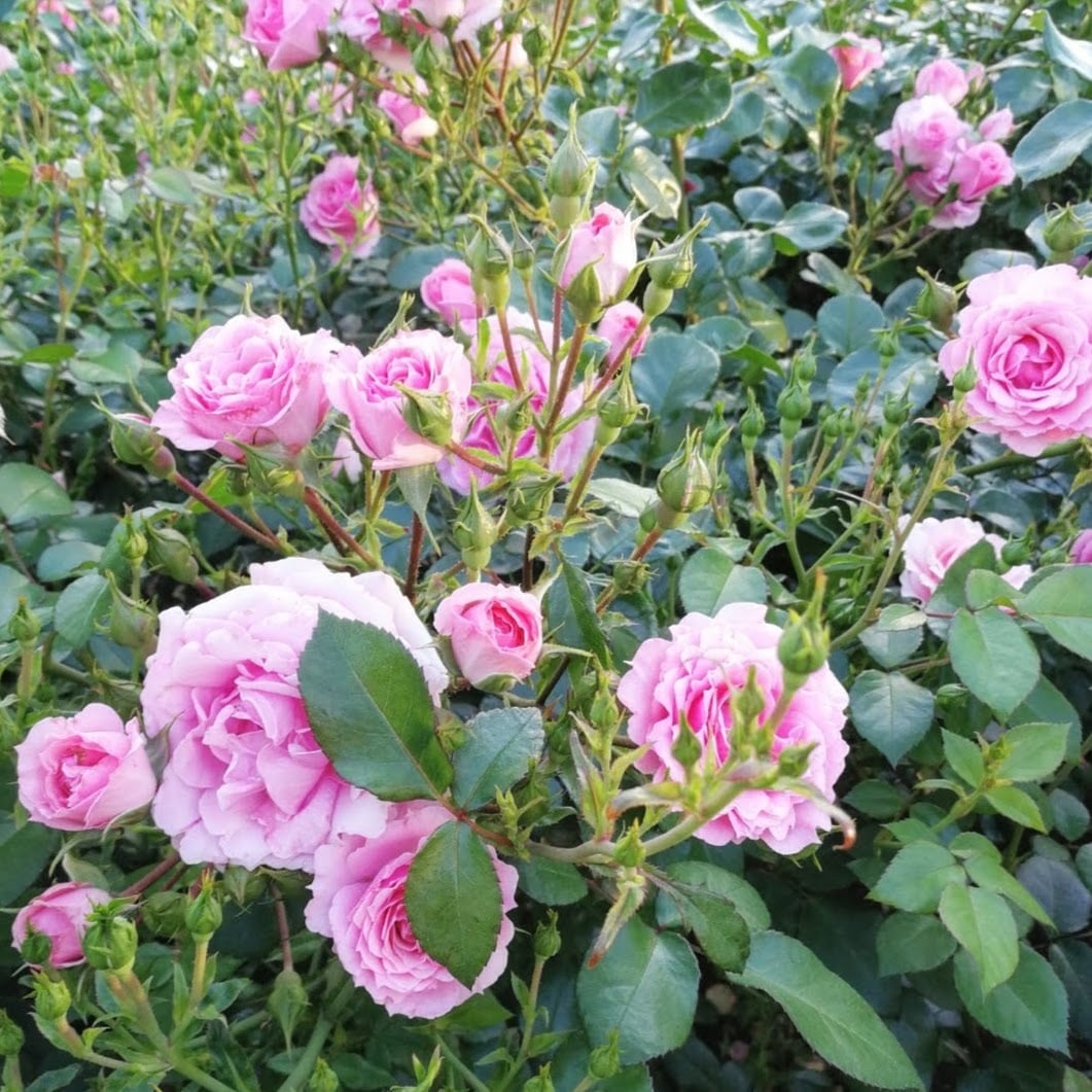 丸弁平咲きの花を大房に咲かせ見事。耐病性に優れ強健、グラウンドカバーとしても有用。枝先が垂れないので使い勝手も良い。2003年殿堂入り。